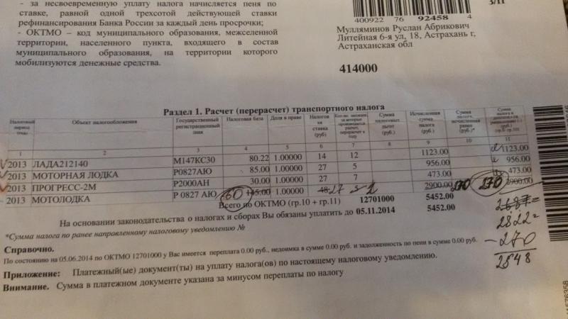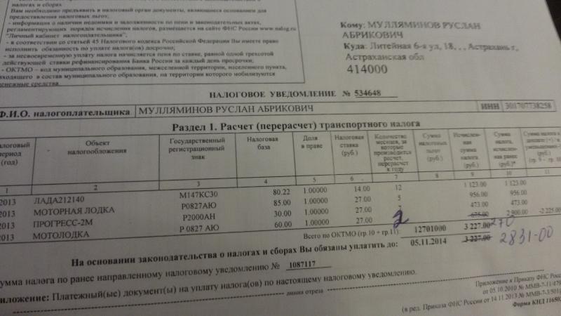 привет всем! Недавно пришло письмо от налоговой. Налог посчитали на лодку на которой зарегистрировано два мотора 85л.с и 60л.с очень своеобразно.жена ручкой редактировала У меня оказалось две лодки с одинаковыми бортовыми номерами,причем на одной мотор 85л.с а на другой 85+60=145.и не важно что 85л.с во владении 5мес. а 60л.с всего 2мес.. Пришел разбираться в налоговую......пол часа скандала, в два подхода исправлений и стало жить полегче. Но обмануть , хоть на 9руб все же им удалось