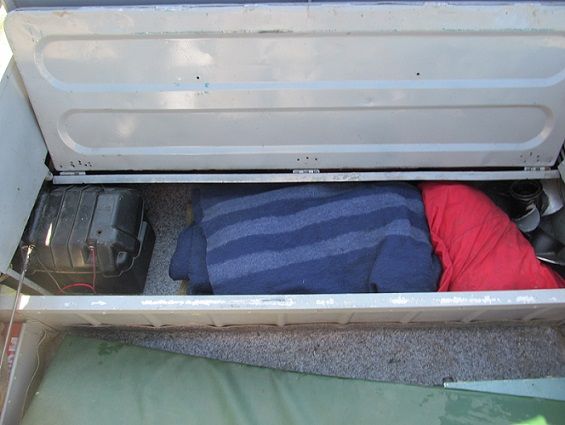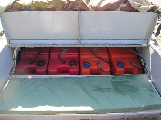 Забыл сказать в задней части кормы установлены краны для перекллючения от одного бака к другому,всего их 2. Под пайолами на которых стоят топливные баки установлена водоотливная помпа.В носовом кокпите размещены 2 -е небольшие сумочки,в одной мыльно рыльное с полотенцем,а во второй моющее средство для посуды. под пайолами в носовом рундуке таганок и туристический топорик