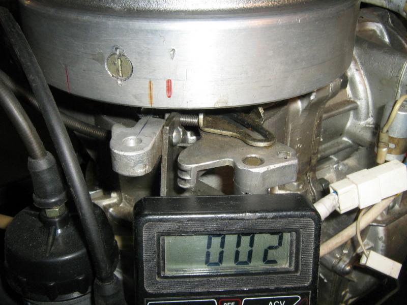 Теперь самая важная задача настроить в точности зазор контактов на втором цилиндре точно по метке, в этом случае и будет синхронность работы системы зажигания, проверяем, настраиваем прибор показал точное совпадение меток, синхронность настроена, проверяем УОЗ 30 градусов так же по меткам и на этом настройка завершена. Не забудьте изолятор переставить на другой контакт, а потом удалить.