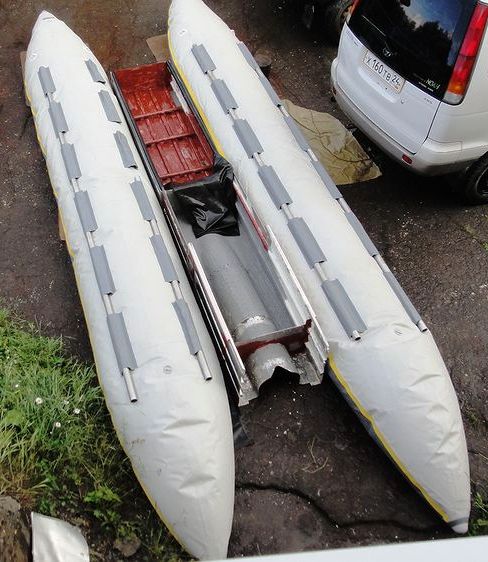 Этому предшествовала работа над ошибками и доводками по улучшайтингу обтекаемости корпуса по мыслимым и не мыслимым коварствам воды, что контактирует с промежностью катамарана. Главное, не поднимать корпусом ни грамма лишней воды, а давить ее! Дднище не плуг, это утюг давящий 4-мя сотнями килограмм на поверхность воды . А миксированная вода от баллонов резво бьется о борта ( это-ж реданы в первом приближении!) и отдавая подъемную силу уходит в корму по двум боковым просветам между коробом и баллонами.