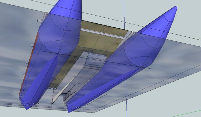 Воздух пойдет по бокам. Вертикальные скеги не дадут попасть ему в тоннель... Доплнительная АКП :... Спереди круговой сектор с центром по оси поворота мотора... поэтому сначала нужно определиться оптимальным углом установки мотора... В разрезе - пластина по форме перевернутой совковой лопаты