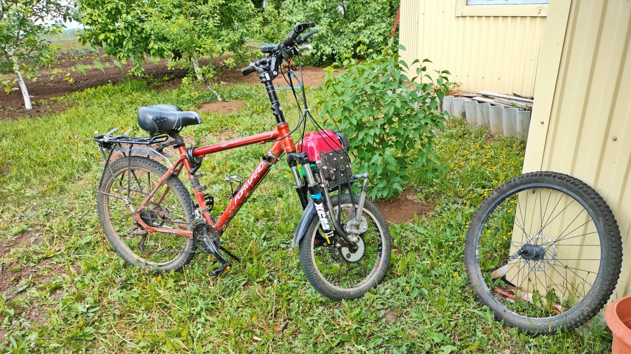 Съёмный модуль моторный, мотор 49с аналог хонды 4т. 2л/с. Разгоняет велосипед с моими 105кг до 40км/ч. В горку, в неё на авто поднимаюсь на 1 передаче, на лисапеде поднимаюсь с педалями. Очень нравится ездить педали +мотор 18-22км/ч. по полям и лесным тропам. Для пенсионера самое то. Вот видео весной