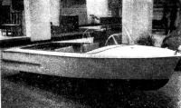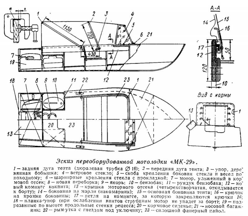Закончив постройку корпуса, можно приступить к изготовлению сидений. Кормовые сиденья размером 440X1100 вырезают из 8-миллиметровой фанеры. Они устанавливаются на фанерных подпорках, подшитых рейками, но крепить их окончательно лучше после покраски катера. У транца сиденья опирают на рейки. Съемный носовой диван имеет сиденье размером 450 X1265 и спинку 400 X1160 мм; он крепится у бортов на две подставки из доски толщиной 15 мм, которые ложатся на шп. 3 и 4. Кроме того, предусмотрена средняя съемная стойка из 8-миллиметровой фанеры, которая опирается на киль. Спинка дивана упирается в две бобышки у комингса и рейку, подшитую на верхней стороне сиденья. Для большей жесткости ее верхняя кромка подшита рейкой сечением 20X20.