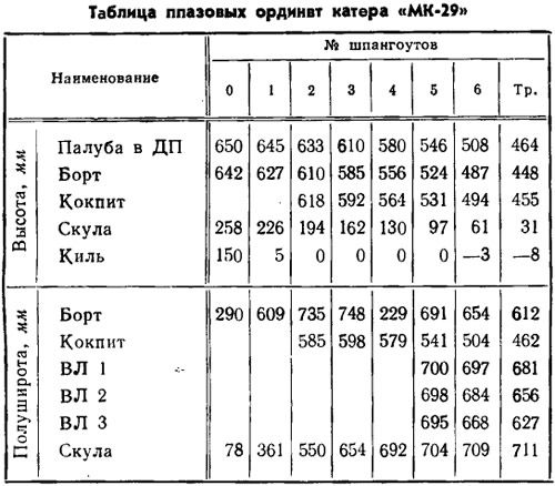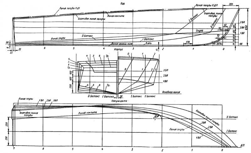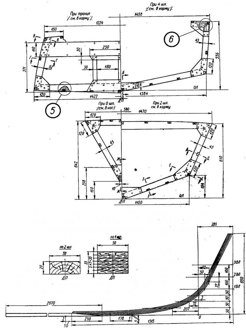 Постройку катера рекомендуется начинать с изготовления шпангоутов. На плазе вычерчивается сначала наружный контур шпангоута, а затем, отступя на 45 мм, — внутренний. Выпуклые бимсы шп. 1 и 2 вычерчивают по трем точкам с помощью изогнутой рейки. У остальных шпангоутов (кроме транца) вместо бимсов имеются только полубимсы и временные распорки. Распорки прибивают точно на высоте 400 мм и на них также отмечается диаметральная плоскость (ДП). Нижние ветви — флортимберсы — шп. 1 имеют выпуклость, которая обеспечивает плавную укладку фанерной обшивки. Стрелка выпуклости равна 7 мм.