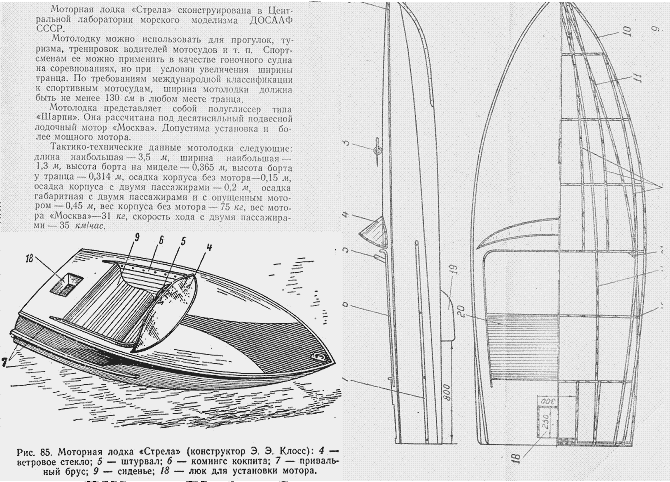 Вот похожая по размерам "Стрела" конструкции Э.Э. Клосса. Видимо подобные лодки строились небольшими сериями в мастерских ДОСААФ для водно-моторного спорта.