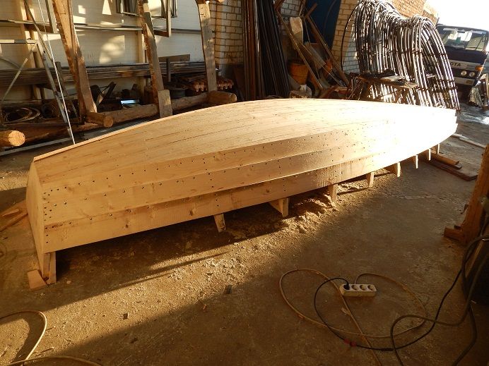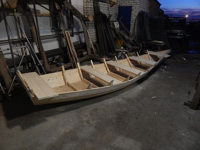 Всем Привет. Давненько мы на форуме ничего не представляли. Начитавшись Циалковского: Длина бежит, а ширина скользит. Все это время строили, что скользит. И все таки пришли к выводу, что приятнее то, что бежит - т.е. водоизмещающий режим. Вот после речного трамвайчика решили сделать плоскодонку. Длина полная 5.5м, ширина по миделю 1.5м, высота борта максимальная 0.6м. С начала процесса фоток не делали. Начали сборку, принес фотик, кое что щелкнули. Начали с шаблонов шпагоутов.