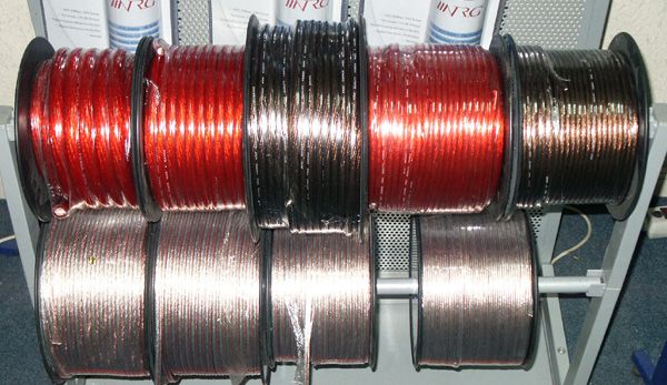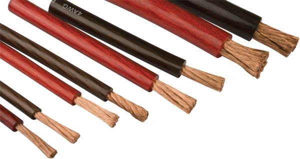 В акустических проводах как правило жилы очень очень тонкие как волосинки и их очень много, он не совсем подходит, а в стартерных проводах возьмите от той же машины (от акб на стартер) там жыли толстые (примерно по 0.7-0.8 жилка) и нагрузку они будут держать лучше и греться думаю будут меньше. не зря же на машины не делают стартерные провода из миллиона волосинок... как то так. Возможно и ошибаюсь.