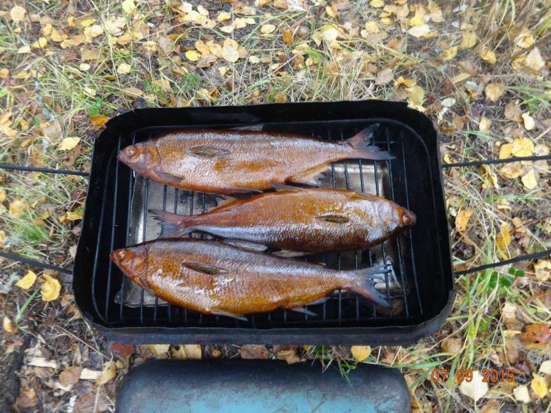 Я обычное копчение делаю, на дровах, на ольхе, а еще смазываю рыбу снаружи и внутри смесью из чеснока и масла подсолнечного, рафинированного, и соль. Обычно коптим лещей.