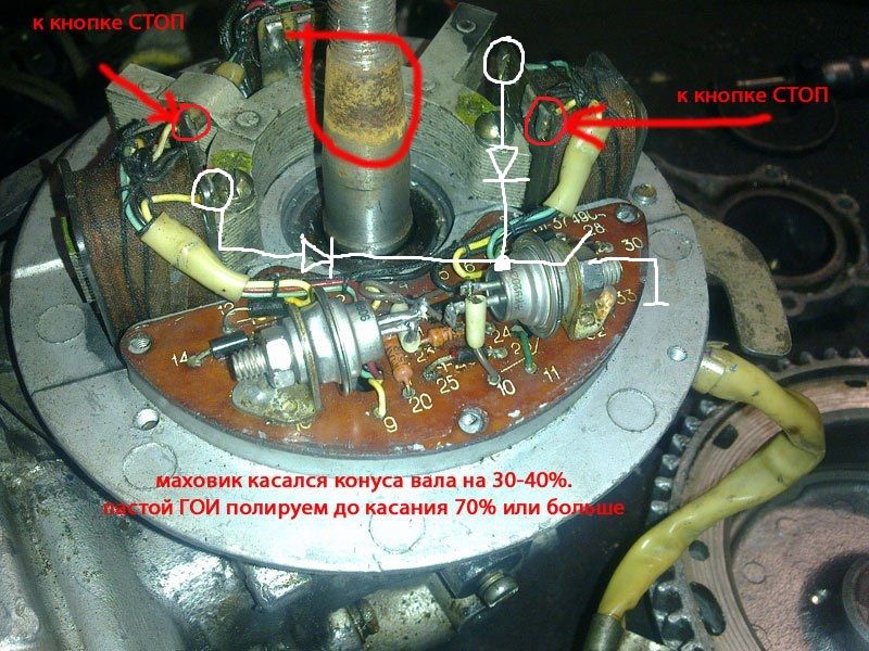 Уважаемые форумчане, помогите с подключением чеки ( или кнопки стоп ) на 12том ветре??? Пробовал два раза подключать и почему-то не глохнет. Чека от мотоблока, с надетым колпачком контакты разомкнуты. При снятии замыкаются. Зажигание МБЭ-3. Подключал через диоды 1N4007. И красным и белым пробовал. Не хочет. Фото не моя.