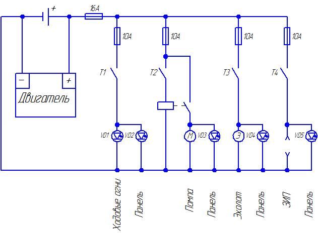 Володя согласно твоей схеме высадить аккумулятор просто не чем, если ты к ней добавишь музыку и прожектор то придётся ставить мощный акк. что бы обеспечить потребители. И того получается один на мотор 30-45Ач. и один на потребители 30-55Ач. Чувствуешь сколько веса......