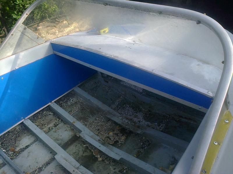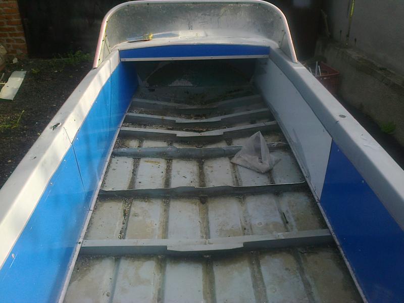 Привет всем.история лодки такова.брат приобрел корпусок.сделан аскетично.фанерное дно(10мм обычной крашенной фанеры разбухшей от воды)и сверху ленолиум.вот и весь тюнинг.единственное что обрадовало что корпус без пробоин и особых вмятин.еще предыдущий хозяин приварил по дну по наруже продольные реданы из мощного уголка.короче понеслась.отодрали фанеру со дна .спереди пространство под фанерой было запенено монтажной пеной.устал выковыривать.кстати при 27 градусной жаре пена в середине была мокрой.потом ободрали старую краску.пожелание брата-лодка должна быть подготовлена чисто для рыбалки.тоесть максимальное пространство для 2-3х человек.решили зашить борта и постелить сплошное дно с квинтета.услышав цену на квинтет энтузиазм брата пропал.короче побегав по знакомым насобирал материала для ремонта.уголок алюминь .всякие полосочки уголочки алюминевые.борта решили зашить какой то дрянью которой обшивают заправки и магниты-между миллиметровым алюминием акрил.материал кстати понравился на вид но весит поболя листового алюминия.после ошкурки и шпаклевания лодку прогрунтовали.начало положено .далее будет процесс зашивки бортов пенофлексом(розовый листовой пенопласт или черт его как он называется)покраска помпа держатели для весел и спинингов.и куча всего на что я смогу уговорить своего аскетичного брата.спереди планируется съемное поворотное кресло а вот как сделать лавку сзади еще не придумал.в планах что то откидное чтобы был доступ в подмоторный отсек.а теперь слайды.......