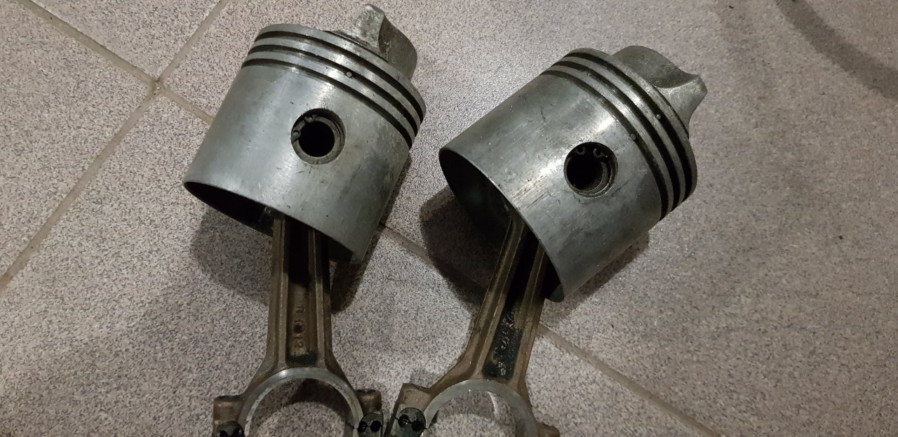 Вот фото поршней, они в комплекте с кольцами, кольца правда Б/У они с моего мотора, но износ не большой, когда ставил на свой мотор новые кольца, разница в зазоре была совсем не большая, Цена пусть будет по 1500 р. за поршень