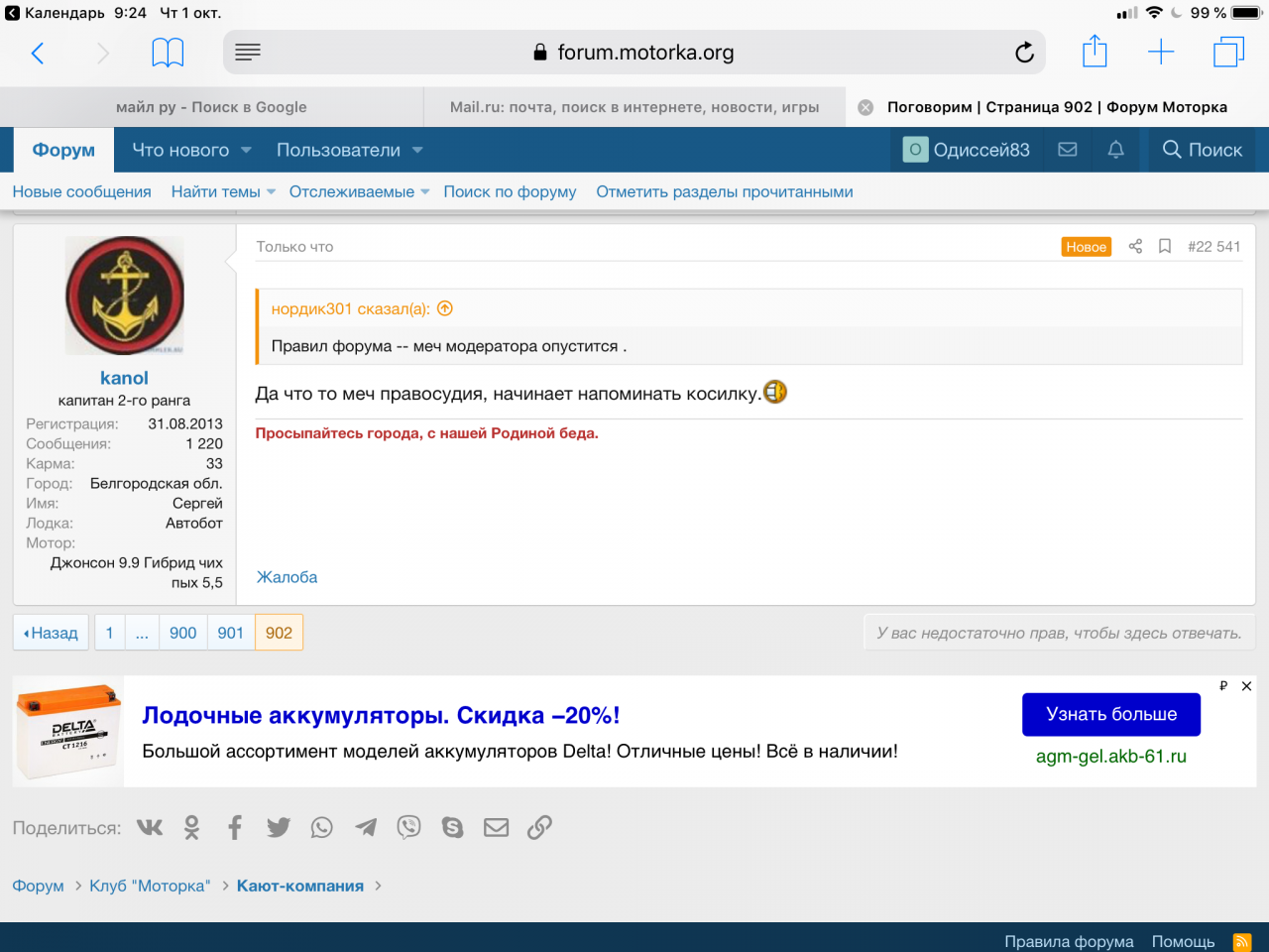 Вот какую угрозу форуму представляет фраза — Одиссея на вас нет? Зачем удалили этот пост? Кого он обидел или оскорбил? Сказано то было в том смысле — загнали противников в споре в бан совместно с кое с кем —и теперь между собой общаетесь...