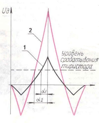 В начальной части амплитуды задаем рабочую точку открывания тиристора. Скажем для ВТ-151 пусть она равна 1 вольт.