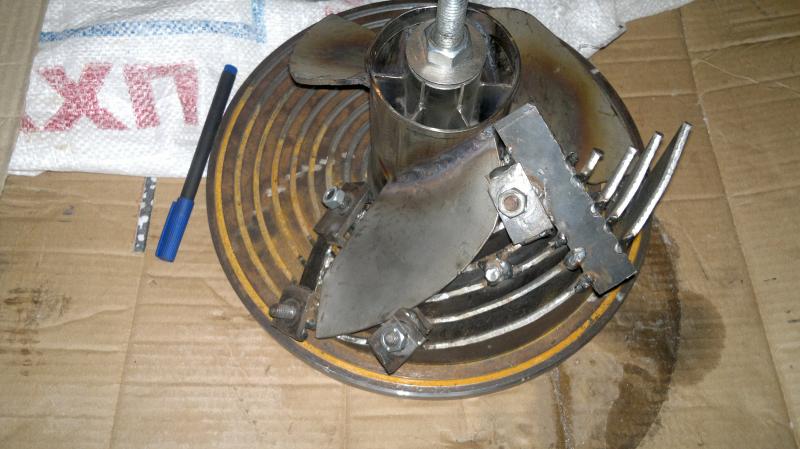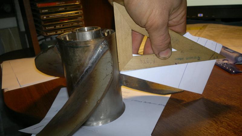 По барабану как варить, пока варили лопасти не чего не уводило (потому что под ними ребра) а потом решил с торцев лопастеи поставить точку, чтоб лопасть в ступицу плавно переходила, вот тут все и случилось, винт уже был холодный. Визуально показалось что угол наклона лопастей маленький получился, быстренько сейчас прикинул, сейчас кажется слишком большой, точность измерения не очень но все же не многовато ли.
