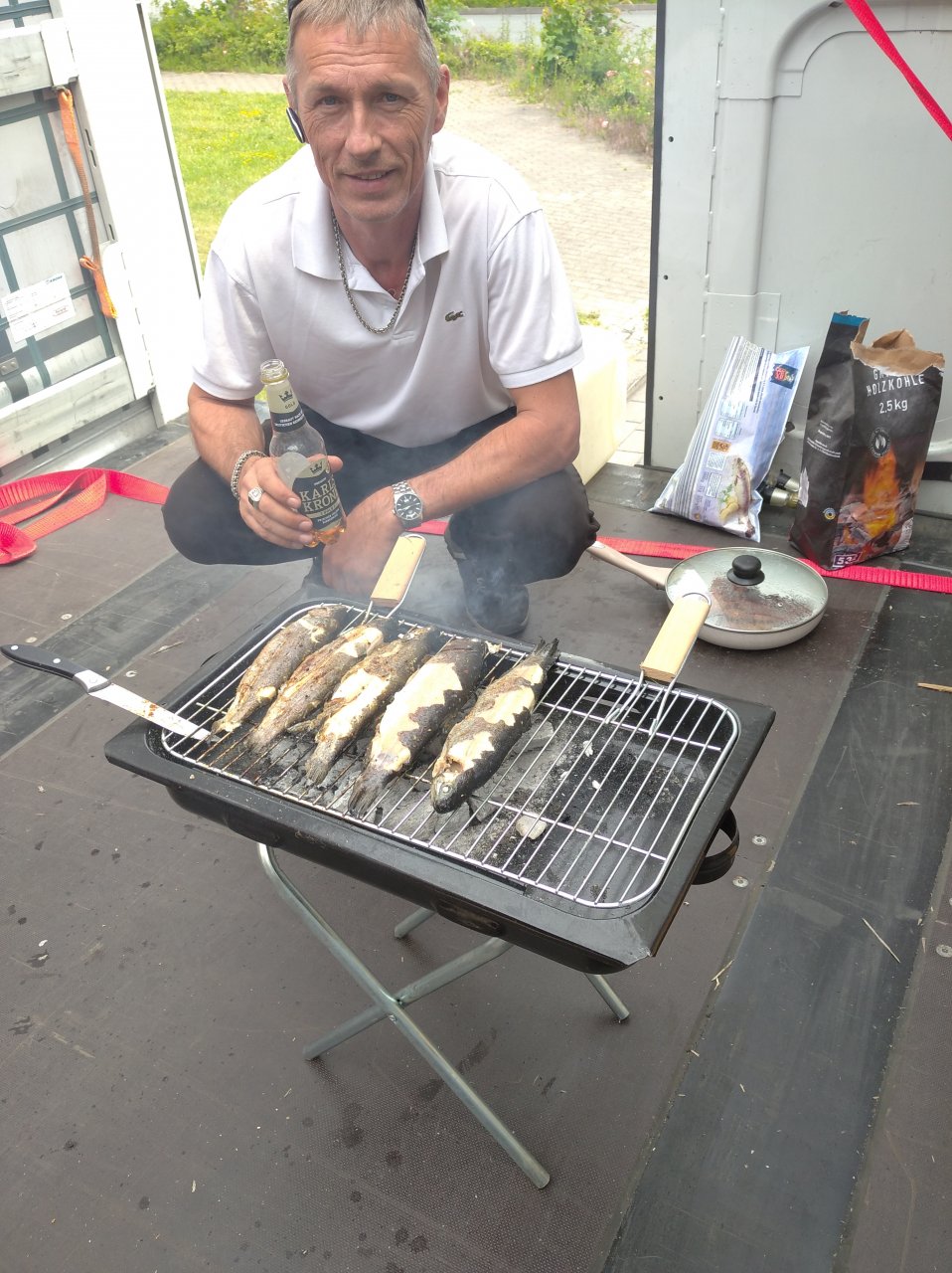Я себе попроще мангал взял, рыбку сначала в фольге протомили, затем обж