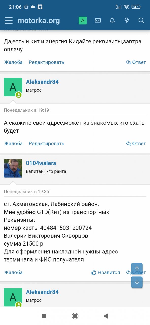 Всем привет.Джентльмены,у меня тут неприятная ситуация сложилась...Опубликовал я тему,о поиске корпуса редуктора,на mercury f 20,ответил мне форумчанин с ником 0104walera,я просмотрел профиль,человек взрослый,тут давно(2014г),куча сообщений,карма,все такое.В общем после недолгих переговоров перевел ему деньги,21500₽ и он пропал,3 дня не отвечает..Как действовать дальше,что посоветуете,может знаком кто?Вроде не похож на мошенника,может быть аккаунт взломали,короче все ещё надеюсь,что это недорозумение
