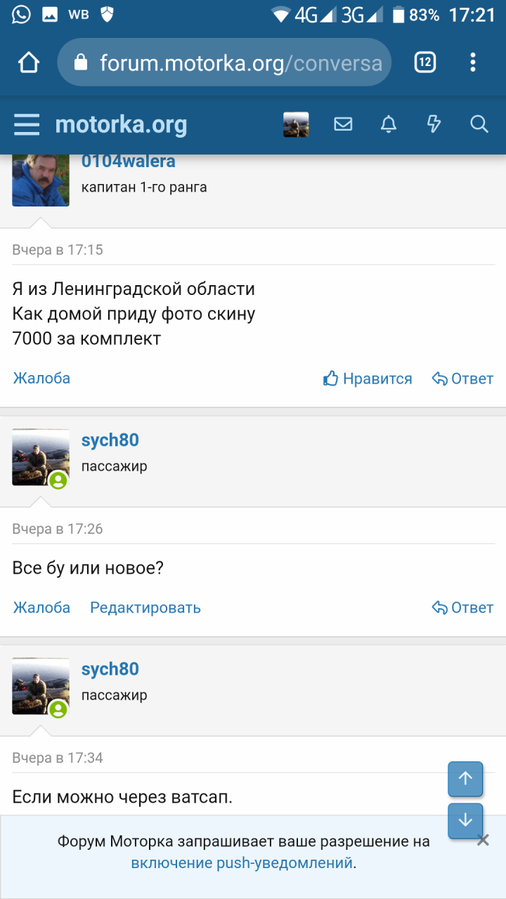 Остерегайтесь человека Роман29, он отписался мне с предложением продать колпак на ветерок, после оплаты пропал, онлайн но на сообщения отвечает, и за март в темах которых он создал, а именно "судовой билет" и "Машинка газ-реверс на Тохатсу 50" на него так же жалобы что после оплаты пропадает, и то что в объявление фото из сети. К сожалению когда переводил ему деньги за колпак жалоб на него в этих темах не было. Очень жаль что такие люди сидят на тематических форумах.