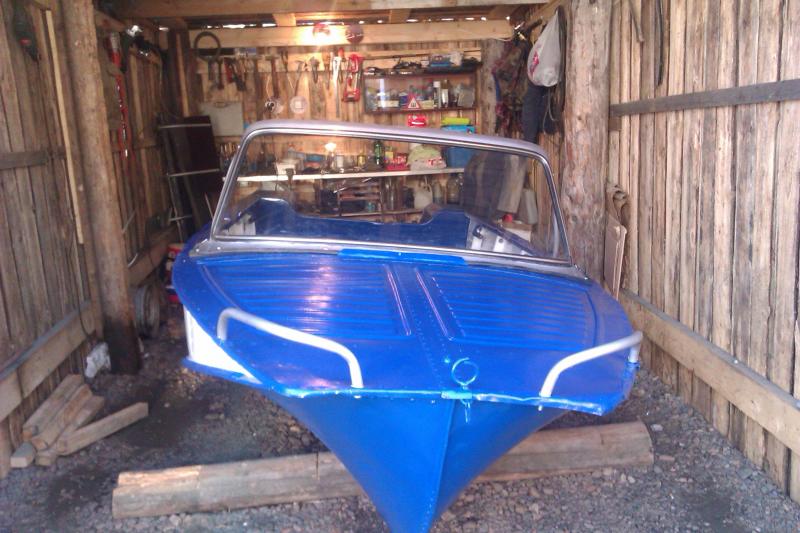В 2013 году я стал обладателем "Воронежа".Лодка была в плачевном состоянии -так я решил при первом осмотре,но после тщательного осмотра понял,что не так всё плохо.Корпус целый без заплат и вмятин ,не гнилой нужно только приложить руки.Лодка была куплена осенью,а в апреле я начал ремонт.За зиму прочитал много инфы как и что делать.Корпус от старой краски очищал шпателем и шкуркой до грунта.Работа трудоёмкая но результатом я остался доволен.Затем покрыл серой грунтовкой по аллюминию в два слоя,к сожалению не помню названия.После краской ПФ-115 также в два слоя.За три года ничего не выцвело и не отпало краска держится крепко.Стекло решил поставить от "копейки" встаёт как родное,благо примеров достаточно и найти не сложно на любом разборе.Получилось довольно симпатично и крепко.А вот с транцем пришлось повозиться.На родном транце мотор висит низко и при глиссере получается "петух" заснять не удалось но поверьте зрелище не приятное брызги подномолись на пол метра.Делал из ламинированной фанеры 12мм в несколько слоёв.Транец поднял на 40мм.Высота дейвуда мотора 380мм,что получилось видно на фото.После испытания "петух"исчез,воздух не подхватывает в общем в самый раз.