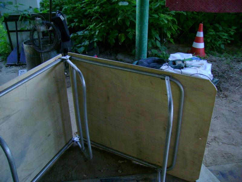 Частенько выезжаю в поле ,на полеты Палатка ,раскладушки,столы , стулья. Вообщем все для полноценного отдыха. Так вот были у меня на чердаке пара советских раскладушек. Пошил я на них брезент ,восстановил, но не получил того чего хотел. Через пару ночей брезент от земли отсырел и провис аж до перемычки. Вообщем решил "мудернизировать" и превратить раскладушку в полноценную кровать , а при отсутствии стола и в шикарный стол примерно на восемь морд.