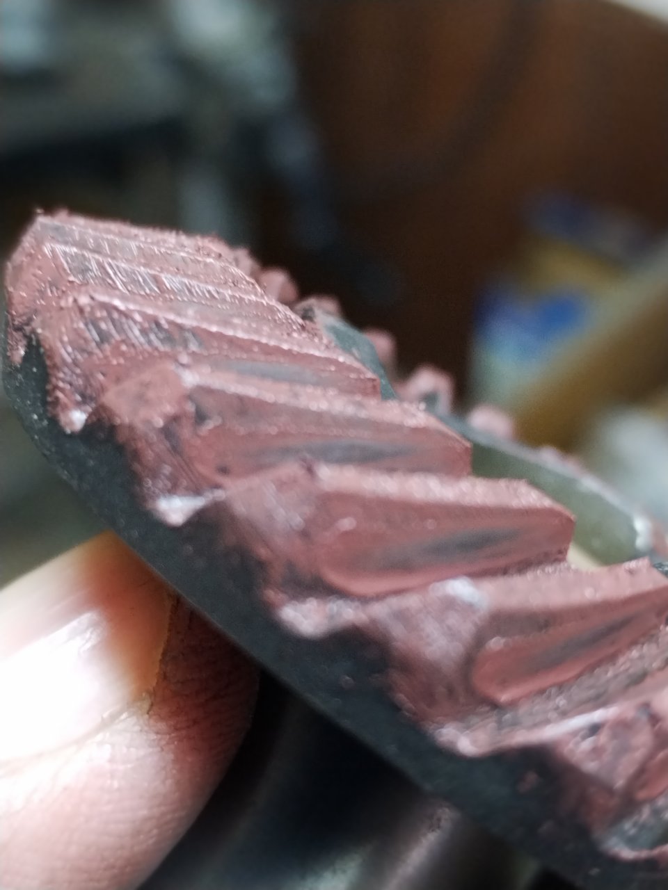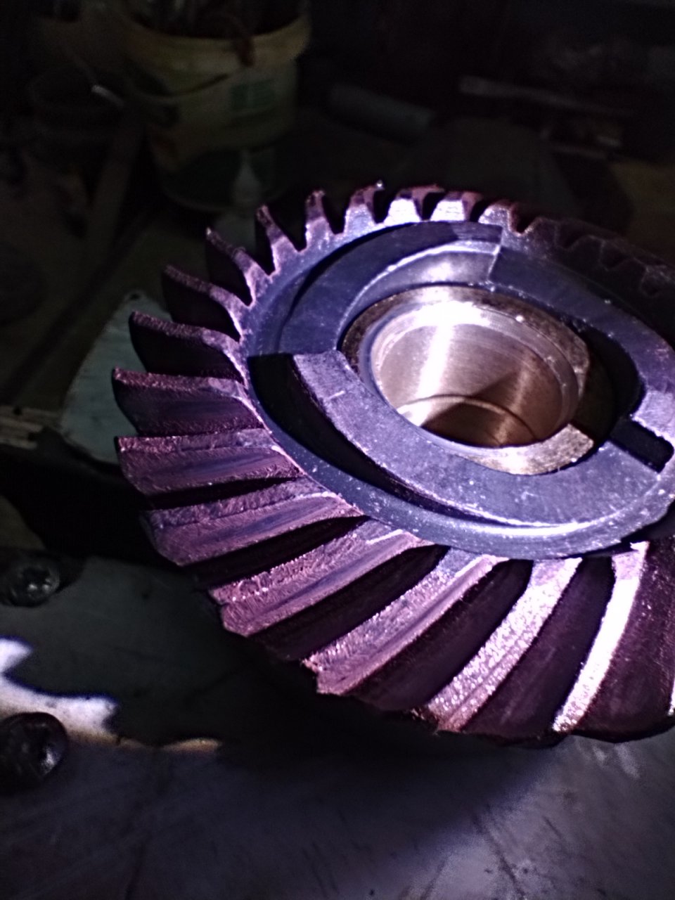 На мысль о не большой не соостности и из за этого ни возможности выставить правильное пятно контакта натолкнула то что на родной шестерни переднего хода износ в том же месте что пятно после всех попыток отрегулировать правильно.