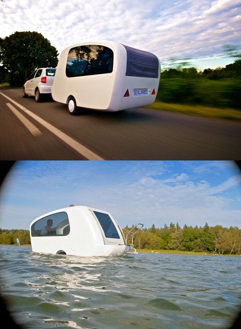 Ещё одна интересная идея, которую косвенно можно отнести к амфибиям. Сначала про предпосылки... автомобиль коренным образом отличается от лодки своей прочностью. Это понятно - вода намного плотнее воздуха, следовательно и обшивка амфибии должна быть прочнее, чем автомобиля. Второе... часто люди, говоря о том, какая лодка им нужна, упоминают о том, что её придётся перевозить на прицепе... Поневоле напрашивается мысль совместить прицеп и лодку. Вот одна из попыток совместить эти два разных изделия... есть над чем подумать, согласитесь.