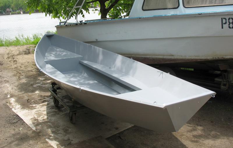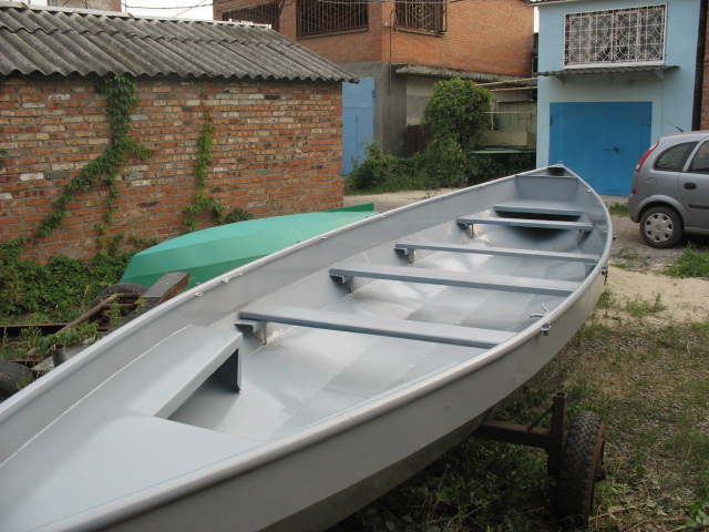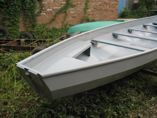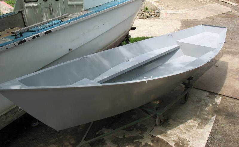 Толщина стали для изготовления такой лодки должна быть не более 2 мм при длине до 5м. И это - с большим запасом. Вполне подойдёт даже сталь толщиной менее 1мм, но при этом наружная обшивка должна быть гофрированной. Гофры могут быть разной формы. Можно применить прямоугольные, как на голубой лодке на фото, можно треугольные. Размеры треугольного гофра могут быть примерно 20 мм по высоте и 40 мм по основанию. Шаг гофров примерно 3-4 ширины гофра по основанию. Планширь можно сделать из уголка (50х50) или трубы диаметром не менее 32 мм. При всём при этом можно обойтись совсем без набора, если грамотно использовать в качестве рёбер жёсткости другие элементы конструкции (банки, блоки плавучести и тд).